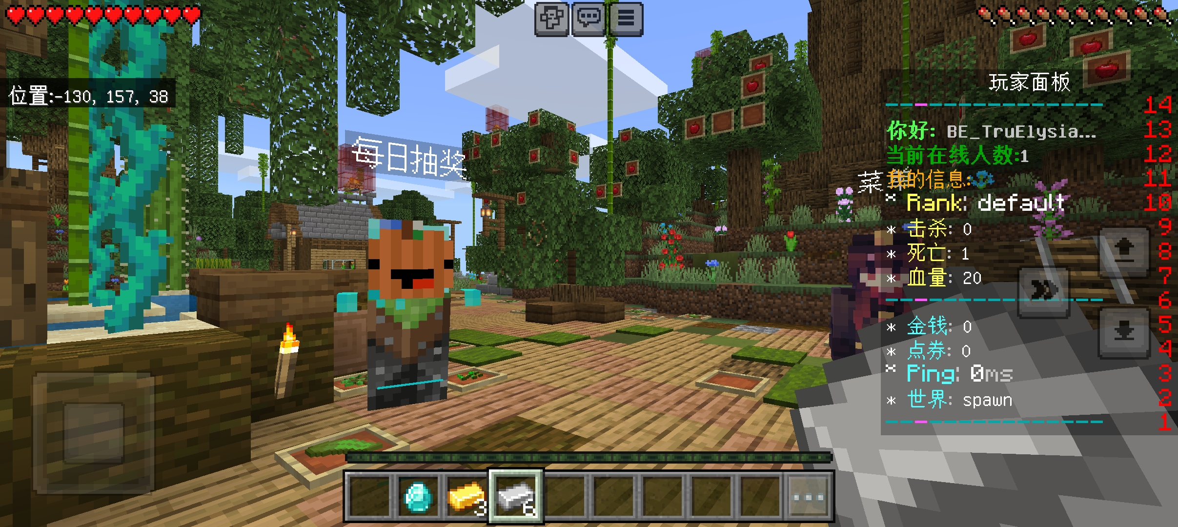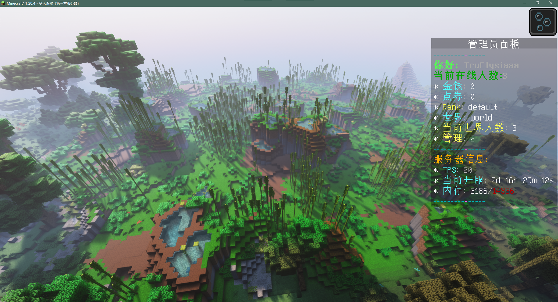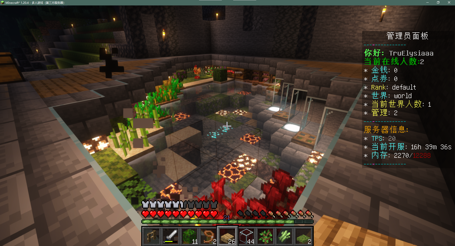 相比一周目,我为它添加了更多好玩的特性:粘液,生电,独立主城,MMORPG特性,更多附魔,武器,地牢以及优美的地形生成,动态难度BOSS,还有更多结构和玩法优化,还有单独的PVP/跑酷群服互联,一切为了玩家黏性和爽感服务。